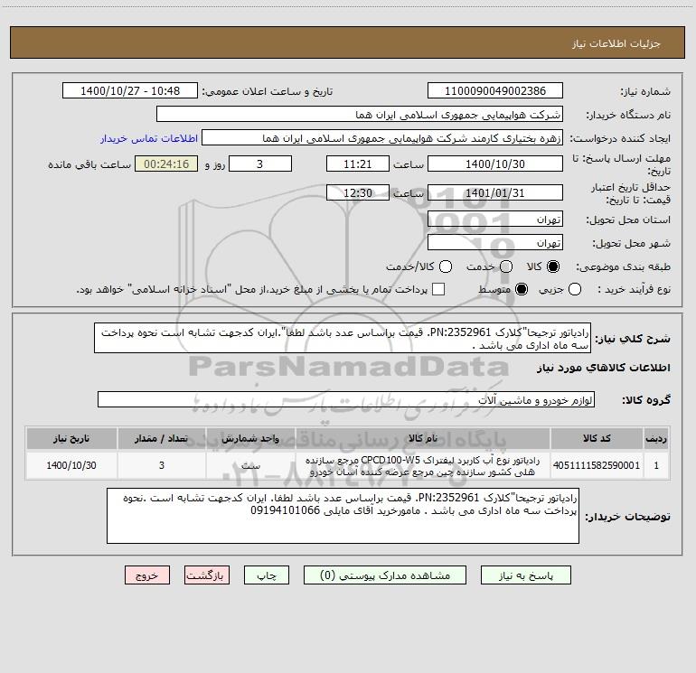 شرح کلی نیاز: رادیاتور ترجیحا"کلارک PN:2352961. قیمت براساس عدد باشد لطفا".ایران کدجهت تشابه است نحوه پرداخت سه ماه اداری می باشد .