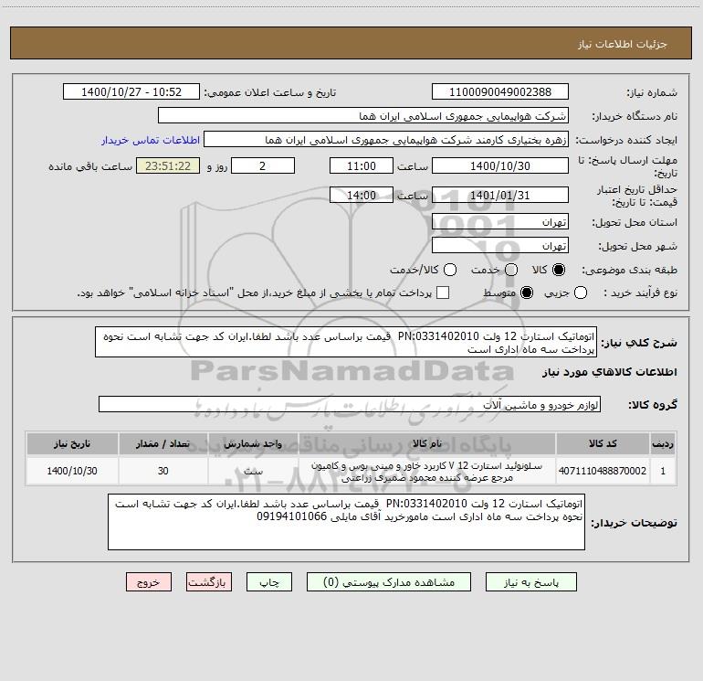شرح کلی نیاز: اتوماتیک استارت 12 ولت PN:0331402010 قیمت براساس عدد باشد لطفا.ایران کد جهت تشابه است نحوه پرداخت سه ماه اداری است