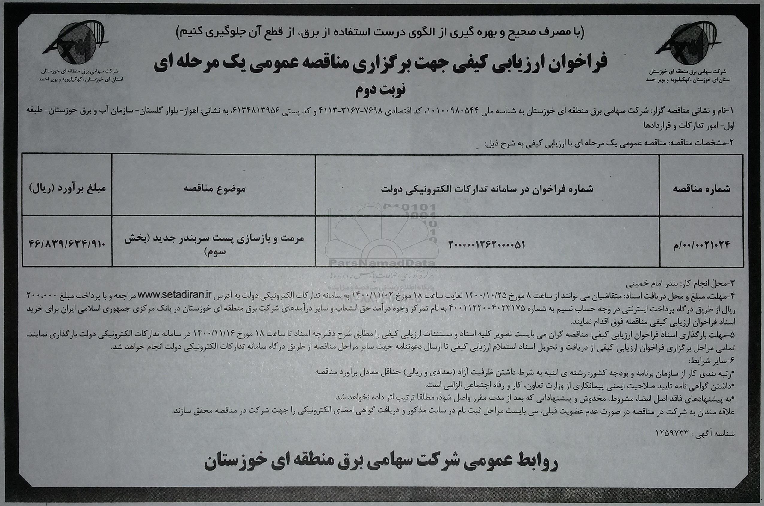 | 00/0021024/م | 2000001262000051 | مرمت و بازسازی پست سربندر جدید (بخش سوم) |