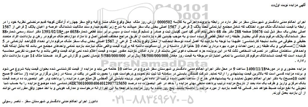 اجرای احکام مدنی دادگستری شهرستان سقز در نظر دارد در رابطه با پرونده اجرائی به کلاسه 0000502 ارزش روز ملک محل وقوع ملک متنازع فیه واقع سقز چهارراه آزادگان کوچه قدیم مرتضایی نظریه خود را در رابطه با قیمت ششدانگ ملک مورد اختلاف که شامل مجتمع آپارتمانی تحت پلاک 2 فرعی از 1567 اصلی بخش یک سقز میباشد به شرح زیر تقدیم میدارم سند مالکیت ششدانگ عرصه و اعیان پلاک 2 فرعی از 1567 اصلی بخش یک سقز ذیل ثبت 10676 صفحه 288 دفتر جلد 68 داخلی بنام آقای محمد امین محمدیان ثبت و صادر و تسلیم گردیده است و سپس برابر سند قطعی شماره6038 مورخ1391/02/18 دفتر اسناد رسمی شماره88 سقز ششدانگ پلاک مرقوم بنام آقای بختیار خلیفه زاده انتقال قطعی گردیده است و به موجب چندین فقره بازداشت از طریق مراجع مختلف قضایی اصل و تا مازاد دوازدهم ملک مرقوم در رهن و بازداشت افراد متعدد حقیقی و حقوقی می باشد نتیجه کارشناسی: علیهذا با توجه به بازدید به عمل آمده توسط اینجانب از محل وقوع پلاک 2 فرعی از 1567 اصلی بخش یک سقز ملک مرقوم دارای تعداد 10واحد آپارتمانی در 5 طبقهمسکونی و یک طبقه زیر زمین احداث و مورد بهره برداری تعداد 10 خانوا قرار داشته و در آن سکونت داشته که برآورد قیمت واقعی ملک نیازمند بازدید تمامی واحدهای مجتمع می باشد که بدلیل اینکه کلیه واحدهای ساختمان مذکور در تصرف اشخاص ثالث که در این پرونده جزء اصحاب دعوی نمی باشند قرار دارد امکان بازدید مقدور نبوده و قیمت اعلام شده نمی تواند قیمت واقعی باشد و به صورت تقریبی محاسبه گردیده است که قیمت ششدانلک مرقوم کارشناسی با تمامی امتیازات مربوطه به قیمت روز معادل 58/500/000/000 ریال برابر 5/580/000/000 تومان تعیین و گزارش می گردد ضمننا ملک 14 مورد بازداشت دائم رادارد .