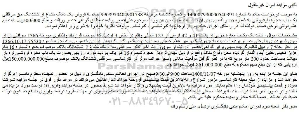 مشخصات اموال : ششدانگ یکباب مغازه جزیی از پلاک 41 و 42 فرعی از 127 اصلی واقع در بخش 3 اردبیل که بموجب قرارداد واگذاری مورخه 1366 سرقفلی آن از سوی شهرداری بنام علی اصغر پرقیمت نسبت به چهاردانگ و میر غلام حسینی نسبت به دودانگ واگذار گردیده و در این خصوص سند اجاره شماره 75530-1366.10.17 در دفتر خانه 7 اردبیل تنظیم گردیده سپس برابر گواهی حصر وراثت از سوی وراث اخیرالذکر سرقفلی سه دانگ مشاع از ششدانگ پلاک موصوف حجره شماره 16 بنام عزیز فخیمی خلیل آباد واگذار گردیده محل وقوع ملک واقع دراردبیل میدان تره بار حجره شماره 16 فاز یک بازدید مورد ارزیابی بصورت یک باب مغازه فروشی تره بار میباشد بمساحت حدود 200 متر مربع که با در نظر گرفتن موقعیت مکانی وسایر جوانب موثر در کارشناسی سرقفلی ششدانگ پلاک موصوف بمبلغ150.000.000.000ریال ارزیابی که از این مبلغ سهم محکوم له مبلغ 4.861.000.000ریال خواهد بود