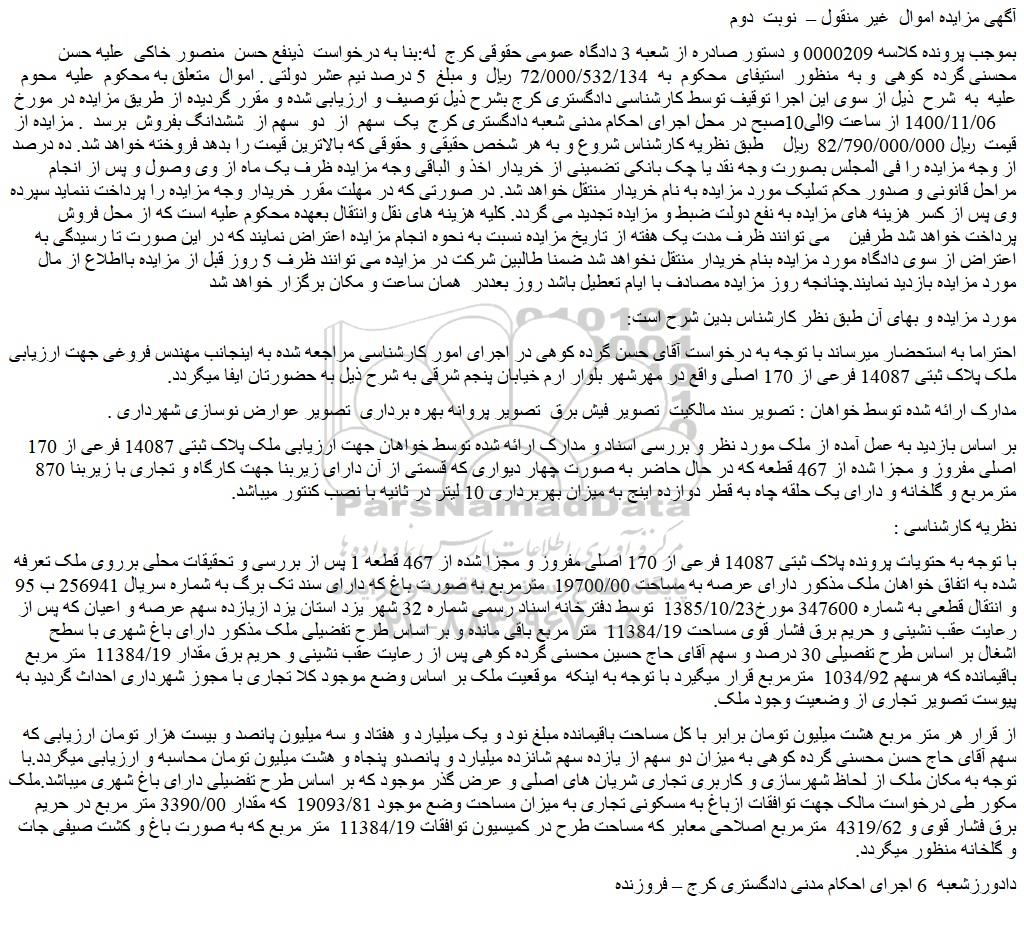 بموجب پرونده کلاسه 0000209 و دستور صادره از شعبه 3 دادگاه عمومی حقوقی کرج  له:بنا به درخواست  ذینفع حسن  منصور خاکی  علیه حسن  محسنی گرده  کوهی  و به  منظور  استیفای  محکوم  به  72/000/532/134  ریال  و مبلغ  5 درصد نیم عشر دولتی . اموال  متعلق به محکوم  علیه  محوم  علیه  به  شرح  ذیل از سوی این اجرا توقیف توسط کارشناسی دادگستری کرج بشرح ذیل توصیف و ارزیابی شده و مقرر گردیده از طریق مزایده در مورخ      1400/11/06 از ساعت 9الی10صبح در محل اجرای احکام مدنی شعبه دادگستری کرج  یک  سهم  از  دو  سهم از  ششدانگ بفروش  برسد  . مزایده از قیمت  ریال 82/790/000/000  ریال    طبق نظریه کارشناس شروع و به هر شخص حقیقی و حقوقی که بالاترین قیمت را بدهد فروخته خواهد شد. ده درصد از وجه مزایده را فی المجلس بصورت وجه نقد یا چک بانکی تضمینی از خریدار اخذ و الباقی وجه مزایده ظرف یک ماه از وی وصول و پس از انجام مراحل قانونی و صدور حکم تملیک مورد مزایده به نام خریدار منتقل خواهد شد. در صورتی که در مهلت مقرر خریدار وجه مزایده را پرداخت ننماید سپرده وی پس از کسر هزینه های مزایده به نفع دولت ضبط و مزایده تجدید می گردد. کلیه هزینه های نقل وانتقال بعهده محکوم علیه است که از محل فروش پرداخت خواهد شد طرفین    می توانند ظرف مدت یک هفته از تاریخ مزایده نسبت به نحوه انجام مزایده اعتراض نمایند که در این صورت تا رسیدگی به اعتراض از سوی دادگاه مورد مزایده بنام خریدار منتقل نخواهد شد ضمنا طالبین شرکت در مزایده می توانند ظرف 5 روز قبل از مزایده بااطلاع از مال مورد مزایده بازدید نمایند.چنانجه روز مزایده مصادف با ایام تعطیل باشد روز بعددر  همان ساعت و مکان برگزار خواهد شد