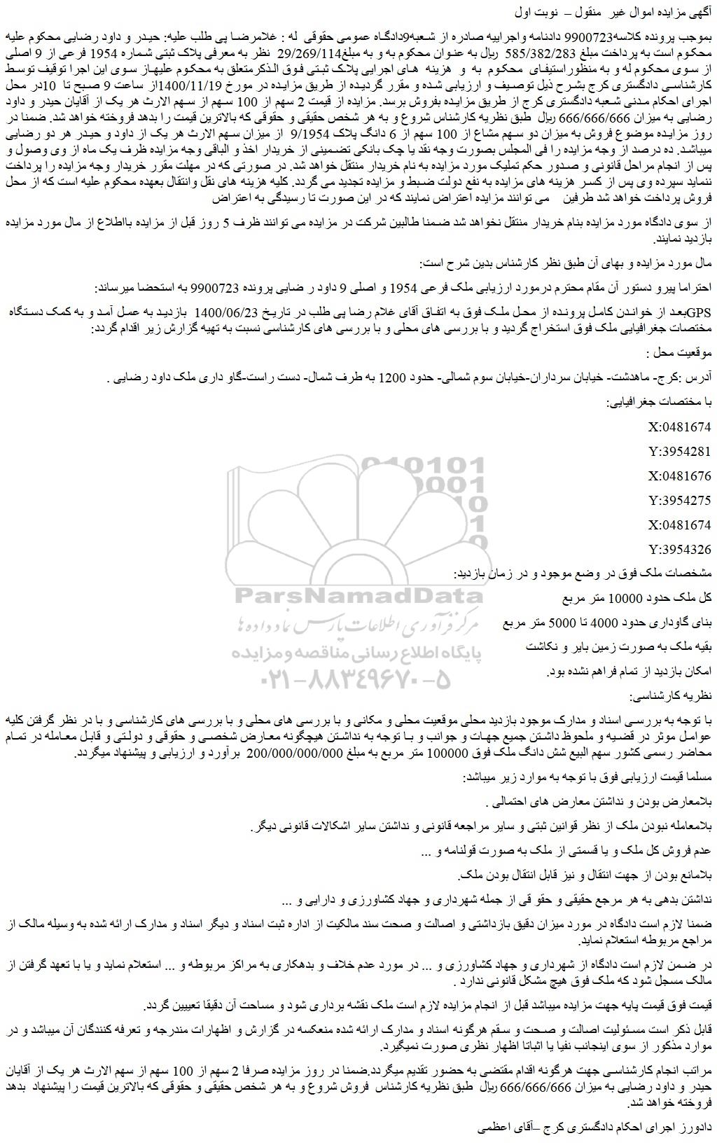 بموجب پرونده کلاسه9900723 دادنامه واجراییه صادره از شعبه9دادگاه عمومی حقوقی له : غلامرضا پی طلب علیه: حیدر و داود رضایی محکوم علیه محکوم است به پرداخت مبلغ 585/382/283 ریال به عنوان محکوم به و به مبلغ29/269/114 نظر به معرفی پلاک ثبتی شماره 1954 فرعی از 9 اصلی از سوی محکوم له و به منظوراستیفای محکوم به و هزینه های اجرایی پلاک ثبتی فوق الذکرمتعلق به محکوم علیهاز سوی این اجرا توقیف توسط کارشناسی دادگستری کرج بشرح ذیل توصیف و ارزیابی شده و مقرر گردیده از طریق مزایده در مورخ 1400/11/19از ساعت 9 صبح تا 10در محل اجرای احکام مدنی شعبه دادگستری کرج از طریق مزایده بفروش برسد. مزایده از قیمت 2 سهم از 100 سهم از سهم الارث هر یک از آقایان حیدر و داود رضایی به میزان 666/666/666 ریال طبق نظریه کارشناس شروع و به هر شخص حقیقی و حقوقی که بالاترین قیمت را بدهد فروخته خواهد شد. ضمنا در روز مزایده موضوع فروش به میزان دو سهم مشاع از 100 سهم از 6 دانگ پلاک 9/1954 از میزان سهم الارث هر یک از داود و حیدر هر دو رضایی میباشد. ده درصد از وجه مزایده را فی المجلس بصورت وجه نقد یا چک بانکی تضمینی از خریدار اخذ و الباقی وجه مزایده ظرف یک ماه از وی وصول و پس از انجام مراحل قانونی و صدور حکم تملیک مورد مزایده به نام خریدار منتقل خواهد شد. در صورتی که در مهلت مقرر خریدار وجه مزایده را پرداخت ننماید سپرده وی پس از کسر هزینه های مزایده به نفع دولت ضبط و مزایده تجدید می گردد. کلیه هزینه های نقل وانتقال بعهده محکوم علیه است که از محل فروش پرداخت خواهد شد طرفین می توانند مزایده اعتراض نمایند که در این صورت تا رسیدگی به اعتراض