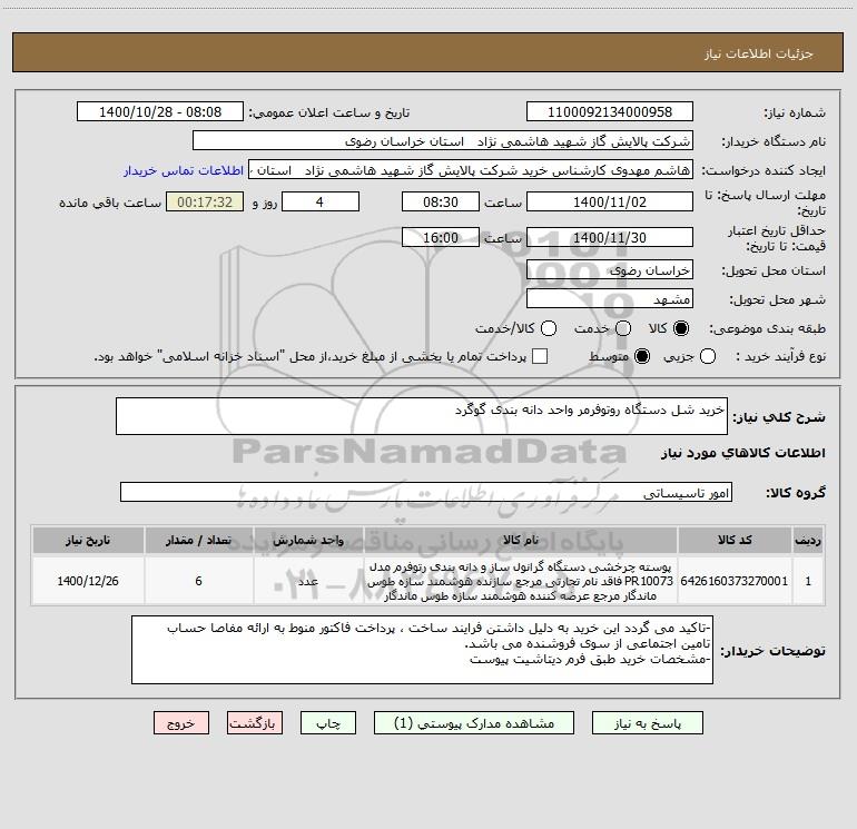 نام دستگاه خریدار:شرکت پالایش گاز شهید هاشمی نژاد استان خراسان رضوی