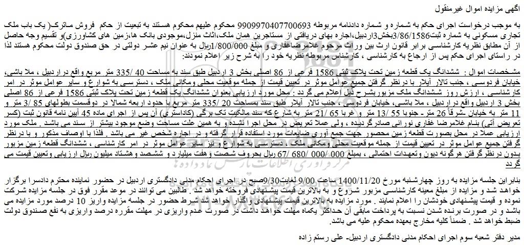 بنابراین جلسه مزایده به روز چهارشنبه مورخ 1400/11/20 ساعت 9/00 لغایت9/30صبح در اجرای احکام مدنی دادگستری اردبیل در حضور نماینده محترم دادسرا برگزار خواهد شد و مزایده از مبلغ معینه کارشناسی مزبور شروع و به بالاترین قیمت پیشنهادی فروخته خواهد شد . طالبین می توانند در موعد مقرر فوق در جلسه مزایده شرکت نموده و قیمت پیشنهادی خودشان را اعلام نمایند . مورد مزایده به بالاترین قیمت پیشنهادی واگذار خواهد شد شرط حضور در جلسه مزایده واریز 10 درصد مورد مزایده می باشد و در صورت برنده شدن نسبت به پرداخت مابقی آن حداکثر یکماه مهلت خواهد داشت در صورت عدم واریزی در مهلت مقرره درصد واریزی به نفع صندوق دولت ضبط خواهد شد . ضمناً کلیه مخارج بعهده محکوم علیه می باشد.