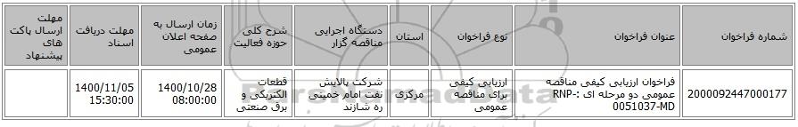 | 2000092447000177 | فراخوان ارزیابی کیفی مناقصه عمومی دو مرحله ای :RNP-0051037-MD | ارزیابی کیفی برای مناقصه عمومی | مرکزی | شرکت پالایش نفت امام خمینی ره شازند | قطعات الکتریکی و برق صنعتی | 1400/10/28 08:00:00 | 1400/11/05 15:30:00 |