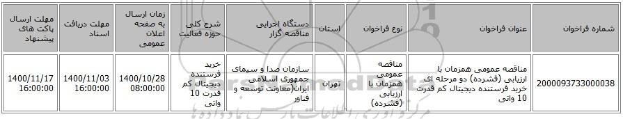 مناقصه، مناقصه عمومی همزمان با ارزیابی (فشرده) دو مرحله ای خرید فرستنده دیجیتال کم قدرت 10 واتی, مناقصه عمومی همزمان با ارزیابی (فشرده) دو مرحله ای خرید فرستنده دیجیتال کم قدرت 10 واتی