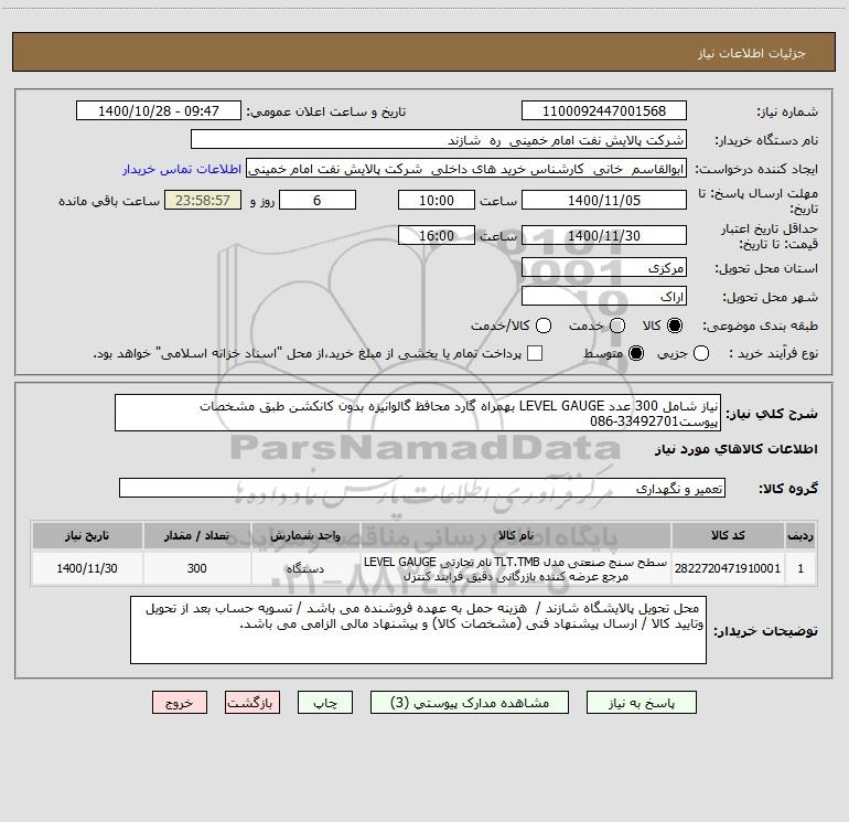 استعلام نیاز شامل 300 عدد LEVEL GAUGE بهمراه گارد محافظ گالوانیزه بدون کانکشن طبق مشخصات پیوست33492701-086, استعلام نیاز شامل 300 عدد LEVEL GAUGE بهمراه گارد محافظ گالوانیزه بدون کانکشن طبق مشخصات پیوست33492701-086
