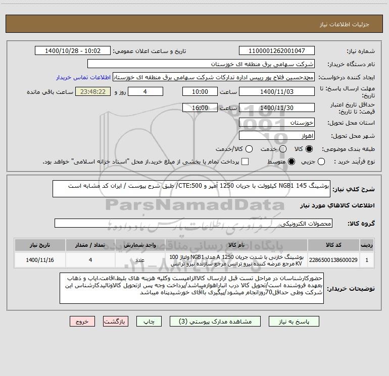 استعلام بوشینگ NGB1 145 کیلوولت با جریان 1250 آمپر و CTE:500/ طبق شرح پیوست / ایران کد مشابه است, استعلام بوشینگ NGB1 145 کیلوولت با جریان 1250 آمپر و CTE:500/ طبق شرح پیوست / ایران کد مشابه است