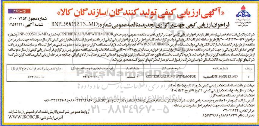 شرکت پالایش نفت امام خمینی (ره) در نظر دارد فراخوان ارزیابی کیفی جهت برگزاری تجدید مناقصه عمومی دو مرحله ای CENTRIFUGAL PUMP WITH MOTOR به شماره (RNP-9905213-MD) و شماره فراخوان 2000092447000176 را از طریق سامانه تدارکات الکترونیکی دولت برگزار نماید کلیه مراحل برگزاری فراخوان ارزیابی کیفی از دریافت و تحویل اسناد استعلام ارزیابی کیفی تا ارسال دعوت نامه جهت سایر مراحل مناقصه از طریق درگاه سامانه تدارکات الکترونیکی دولت ستاد به آدرس ستاد ایران انجام خواهد شد لازم است مناقصه گران در صورت عدم عضویت قبلی مراحل ثبت نام در سایت مذکور و دریافت گواهی امضای الکترونیکی ار جهت شرکت در مناقصه محقق سازند. تاریخ انتشار فراخوان در سامانه تاریخ 1400.10.28 می باشد. اطلاعات و اسناد مناقصه عمومی پس از برگزاری فرآیند ارزیابی کیفی و ارسال دعوت نامه از طریق سامانه ستاد به مناقصه گران ارسال خواهد شد. لازم به ذکر است به استناد قانون حداکثر استفاده از توان تولیدی و خداتی کشور و حمایت از کالای ایرانی چناچه در مرحله ارزیابی کیفی منقاصه گران، شرکت / شرکت های تولید کننده / سازنده کالا شناسایی شوند این شرکت از قبول اسناد و مدارک شرکتهای تامین کننده معذور می باشد.