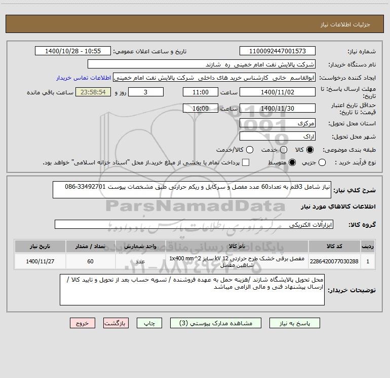 شرح کلی نیاز: نیاز شامل 3قلم به تعداد60 عدد مفصل و سرکابل و ریکم حرارتی طبق مشخصات پیوست 33492701-086