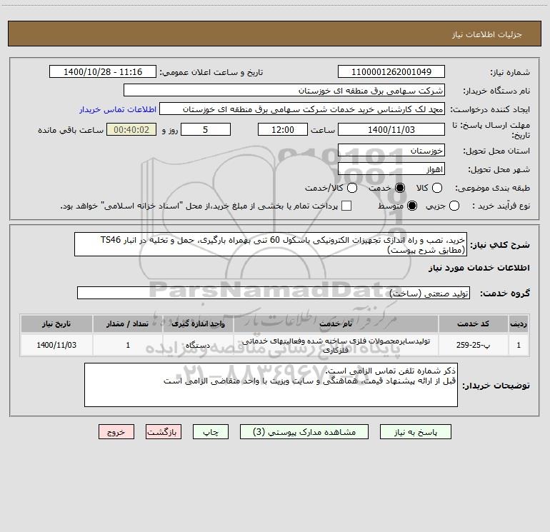 شرح کلی نیاز: خرید، نصب و راه اندازی تجهیزات الکترونیکی باسکول 60 تنی بهمراه بارگیری، حمل و تخلیه در انبار TS46 (مطابق شرح پیوست)