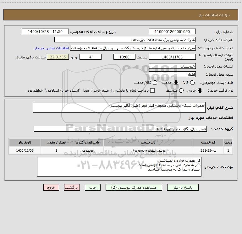 شرح کلی نیاز: تعمیرات شبکه روشنایی محوطه انبار فجر (طبق آنالیز پیوست)