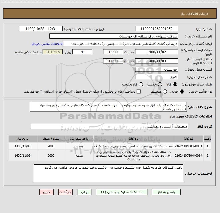 استعلام دستمال کاغذی رول طبق شرح مندرج درفرم پیشنهاد قیمت . تامین کنندکان ملزم به تکمیل فرم پیشنهاد قیمت می باشند ., استعلام دستمال کاغذی رول طبق شرح مندرج درفرم پیشنهاد قیمت . تامین کنندکان ملزم به تکمیل فرم پیشنهاد قیمت می باشند .