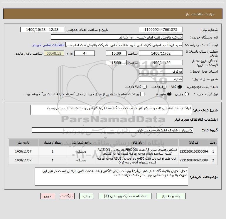 شرح کلی نیاز: ایران کد مشابه- لپ تاب و اسکنر هر کدام یک دستگاه مطابق با گارانتی و مشخصات لیست پیوست