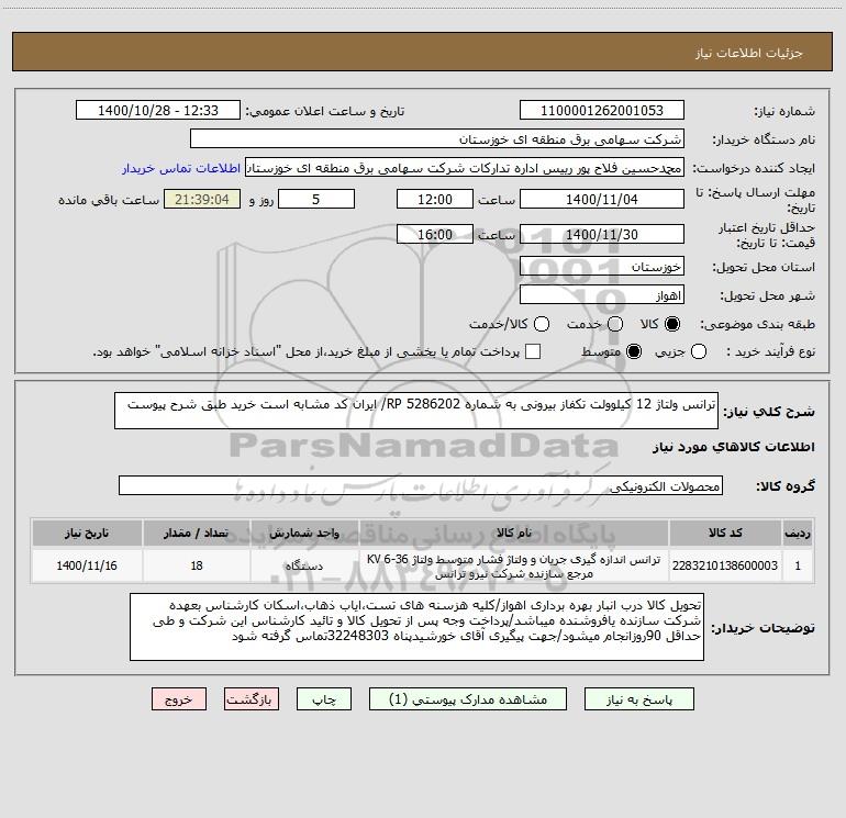 استعلام ترانس ولتاژ 12 کیلوولت تکفاز بیرونی به شماره RP 5286202/ ایران کد مشابه است خرید طبق شرح پیوست, استعلام ترانس ولتاژ 12 کیلوولت تکفاز بیرونی به شماره RP 5286202/ ایران کد مشابه است خرید طبق شرح پیوست