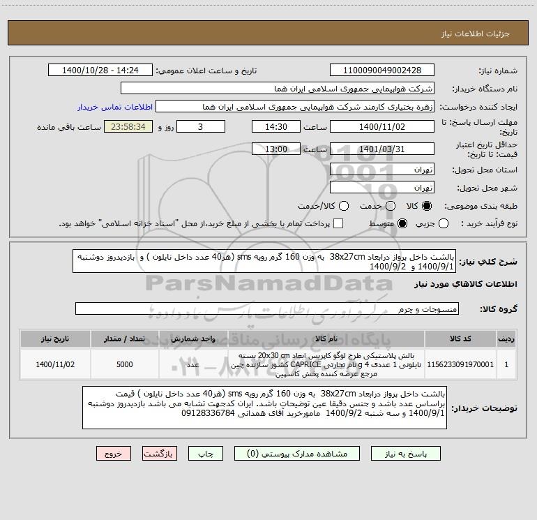 استعلام بالشت داخل پرواز درابعاد 38x27cm به وزن 160 گرم رویه sms (هر40 عدد داخل نایلون ) و بازدیدروز دوشنبه 1400/9/1 و 1400/9/2 , استعلام بالشت داخل پرواز درابعاد 38x27cm به وزن 160 گرم رویه sms (هر40 عدد داخل نایلون ) و بازدیدروز دوشنبه 1400/9/1 و 1400/9/2