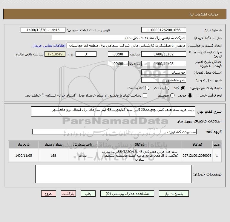 شرح کلی نیاز: بابت خرید سم علف کش توفوردی120لیتر سم گلایفوزیت48 لیتر سازمان برق انتقال نیرو ماهشهر