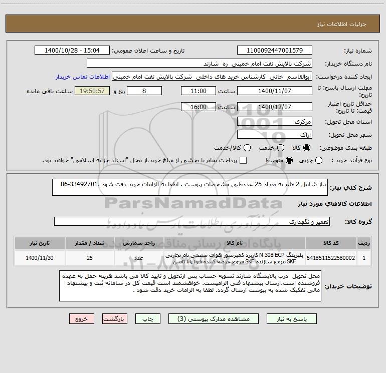 شرح کلی نیاز: نیاز شامل 2 قلم به تعداد 25 عددطبق مشخصات پیوست . لطفا به الزامات خرید دقت شود .33492701-86