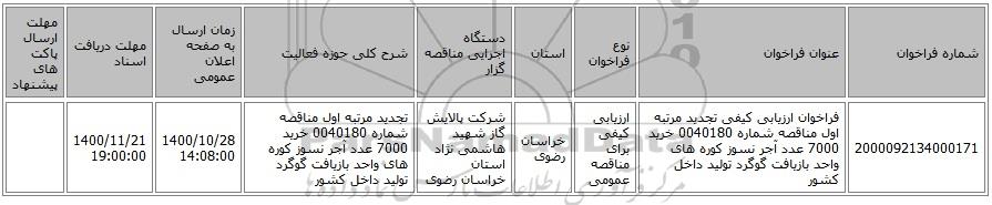 | 2000092134000171 | فراخوان ارزیابی کیفی تجدید مرتبه اول مناقصه شماره 0040180 خرید 7000 عدد آجر نسوز کوره های واحد بازیافت گوگرد تولید داخل کشور | ارزیابی کیفی برای مناقصه عمومی | خراسان رضوی | شرکت پالایش گاز شهید هاشمی نژاد استان خراسان رضوی | تجدید مرتبه اول مناقصه شماره 0040180 خرید 7000 عدد آجر نسوز کوره های واحد بازیافت گوگرد تولید داخل کشور | 1400/10/28 14:08:00 | 1400/11/21 19:00:00 |