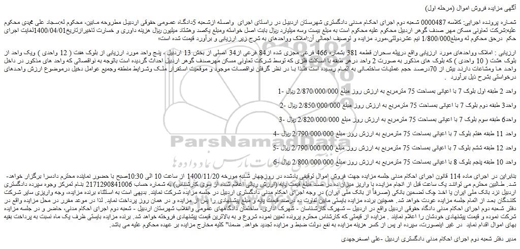 شماره پرونده اجرایی: کلاسه 0000487 شعبه دوم اجرای احکام مدنی دادگستری شهرستان اردبیل در راستای اجرای  واصله ازشعبه 5دادگاه عمومی حقوقی اردبیل مطروحه مابین، محکوم له:سجاد علی محمدی محکوم علیه:شرکت تعاونی مسکن مهر صدف گوهر اردبیل محکوم علیه محکوم است به مبلغ بیست وسه میلیارد ریال بابت اصل خواسته ومبلغ یکصد وهشتاد میلیون ریال هزینه داوری و خسارت تاخیرازتاریخ1400/04/01لغایت اجرای حکم  درحق محکوم له ومبلغ1/800/000 نیم عشردولتی،مورد مزایده و توصیف اجمالی آن:املاک وواحدهای به شرح زیر ارزیابی و برآورد قیمت شده است؛