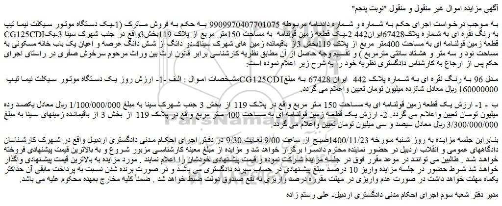 به موجب درخواست اجرای حکم به شماره و شماره دادنامه مربوطه 9909970407701075 به حکم به فروش ماترک (1-یک دستگاه موتور سیکلت نیما تیپ CG125CDIبه رنگ نقره ای به شماره پلاک67428ایران442 2-یک قطعه زمین قولنامه  به مساحت 150متر مربع از پلاک 119بخش3واقع در جنب شهرک سینا 3-یک قطعه زمین قولنامه ای به مساحت 400متر مربع از پلاک 119بخش 3از باقیمانده زمین های شهرک سینا4-دو دانگ از شش دانگ عرصه و اعیان یک باب خانه مسکونی به مساحت نود و سه متر و هشتاد سانتی مترمربع ) و تقسیم وجه حاصل از آن مطابق نظریه کارشناسی برابر قانون ارث بین وراث مرحوم سرخوش صفری در راستای اجرای حکم پس از ارجاع به کارشناس دادگستری نظریه خود را به شرح زیر اعلام نموده است: