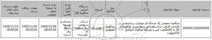 | 2000001262000054 | مناقصه عمومی یک مرحله ای عملیات ساختمانی و افزایش ظرفیت ترانسفورماتور سوم پست شعیبیه از 30 به 50مگاولت آمپر و توسعه دو فیدر خروجی 33کیلوولت | مناقصه عمومی | خوزستان | شرکت سهامی برق منطقه ای خوزستان | پایداری و توسعه شبکه برق استان | 1400/10/29 08:00:00 | 1400/11/04 18:00:00 | 1400/11/14 18:00:00 |