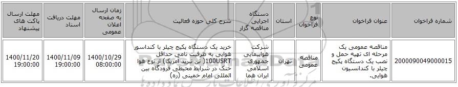| 2000090049000015 | مناقصه عمومی یک مرحله ای تهیه حمل و نصب یک دستگاه پکیج چیلر با کندانسیون هوایی. | مناقصه عمومی | تهران | شرکت هواپیمایی جمهوری اسلامی ایران هما | خرید یک دستگاه پکیج چیلر با کنداسور هوایی به ظرفیت نامی حداقل 100USRT( تن تبرید آمریکا) از نوع هوا خنک در شرایط محیطی فرودگاه بین المللی امام خمینی (ره) | 1400/10/29 08:00:00 | 1400/11/09 19:00:00 | 1400/11/20 19:00:00 |