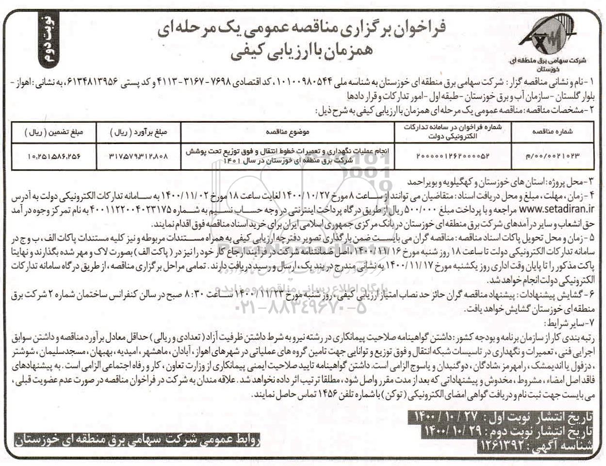 2000001262000052 انجام عملیات نگهداری و تعمیرات خطوط انتقال و فوق توزیع تحت پوشش شرکت برق منطقه ای خوزستان در سال 1401