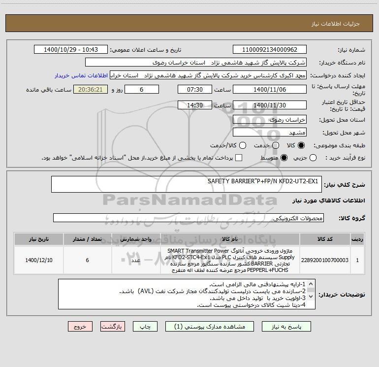 نام دستگاه خریدار:شرکت پالایش گاز شهید هاشمی نژاد استان خراسان رضوی