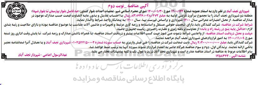 شهرداری نجف آباد در نظر دارد عملیات احداث بلوار کشاورز (حدفاصل بلوار بهارستان تا بلوار شهدا) منطقه دو شهرداری نجف آباد را با مجموع برآورد تقریبی اولیه به مبلغ 83.636.048.472 ریال با احتساب تعدیل و بدون مابه تفاوت قیمت حسب مدارک موجود در مدارک مناقصه از محل اعتبارات عمرانی سال 1400 شهرداری و براساس فهرست بها سال 1400 به پیمانکار واجد شرایط واگذار نماید.
