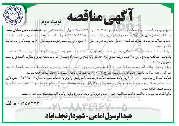 شهرداری نجف آباد در نظر دارد عملیات تکمیل خیابان آبشار منطقه یک شهرداری نجف آباد را با مجموع براورد تقریبی ریال به مبلغ 17.785.092.658 ریال با احتساب تعدیل و بدون مابه تفاوت قیمت حسب مدارک موجود در مدارک مناقصه از محل اعتبارات عمرانی سال 1400 شهرداری و براساس فهرست بها سال 1400 به پیمانکار واجد شرایط واگذار نماید.