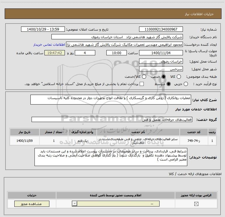 نام دستگاه خریدار:شرکت پالایش گاز شهید هاشمی نژاد استان خراسان رضوی
