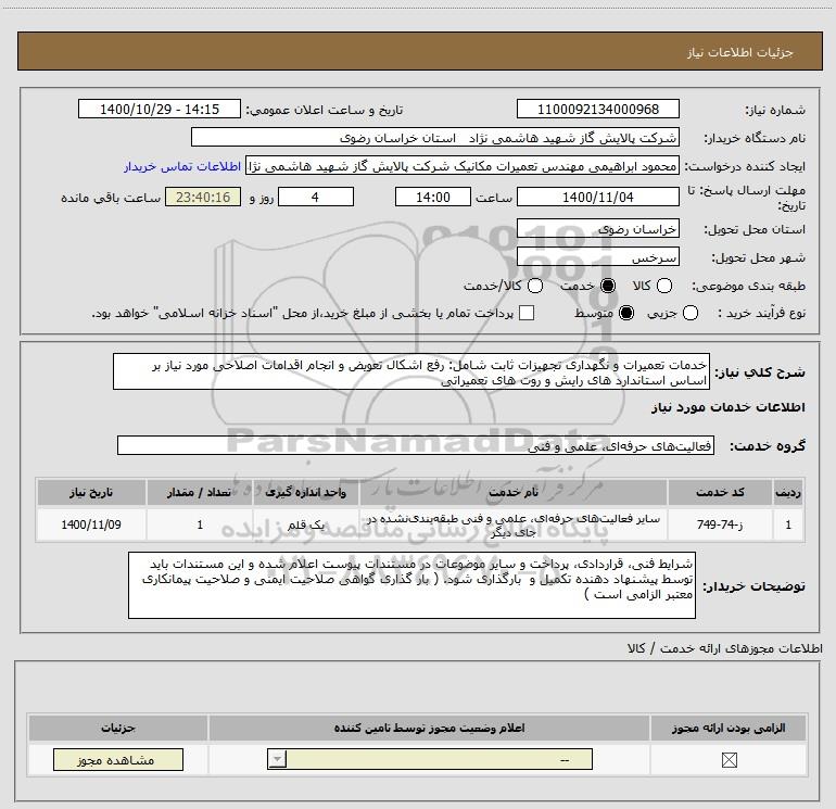 نام دستگاه خریدار:شرکت پالایش گاز شهید هاشمی نژاد استان خراسان رضوی