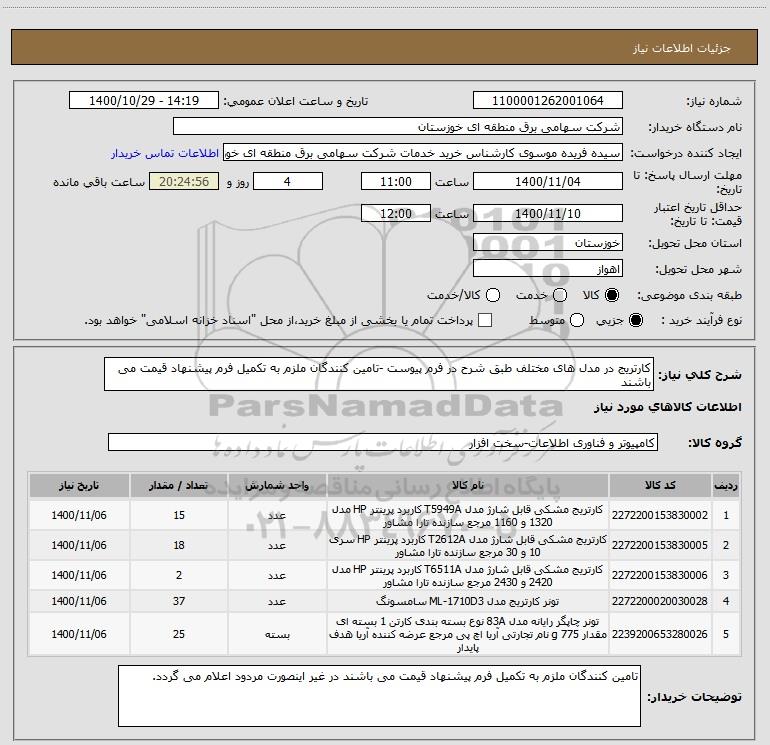 استعلام کارتریج در مدل های مختلف طبق شرح در فرم پیوست -تامین کنندگان ملزم به تکمیل فرم پیشنهاد قیمت می باشند, استعلام کارتریج در مدل های مختلف طبق شرح در فرم پیوست -تامین کنندگان ملزم به تکمیل فرم پیشنهاد قیمت می باشند