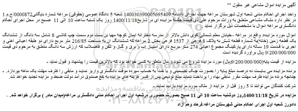 - مزایده در تاریخ 1400/11/18روز دوشنبه ساعت 10 الی 11 صبح بصورت حضوری درشعبه اول اجرای احکام مدنی دادگستری مراغه(میدان مادر ) برگزار خواهد شد.