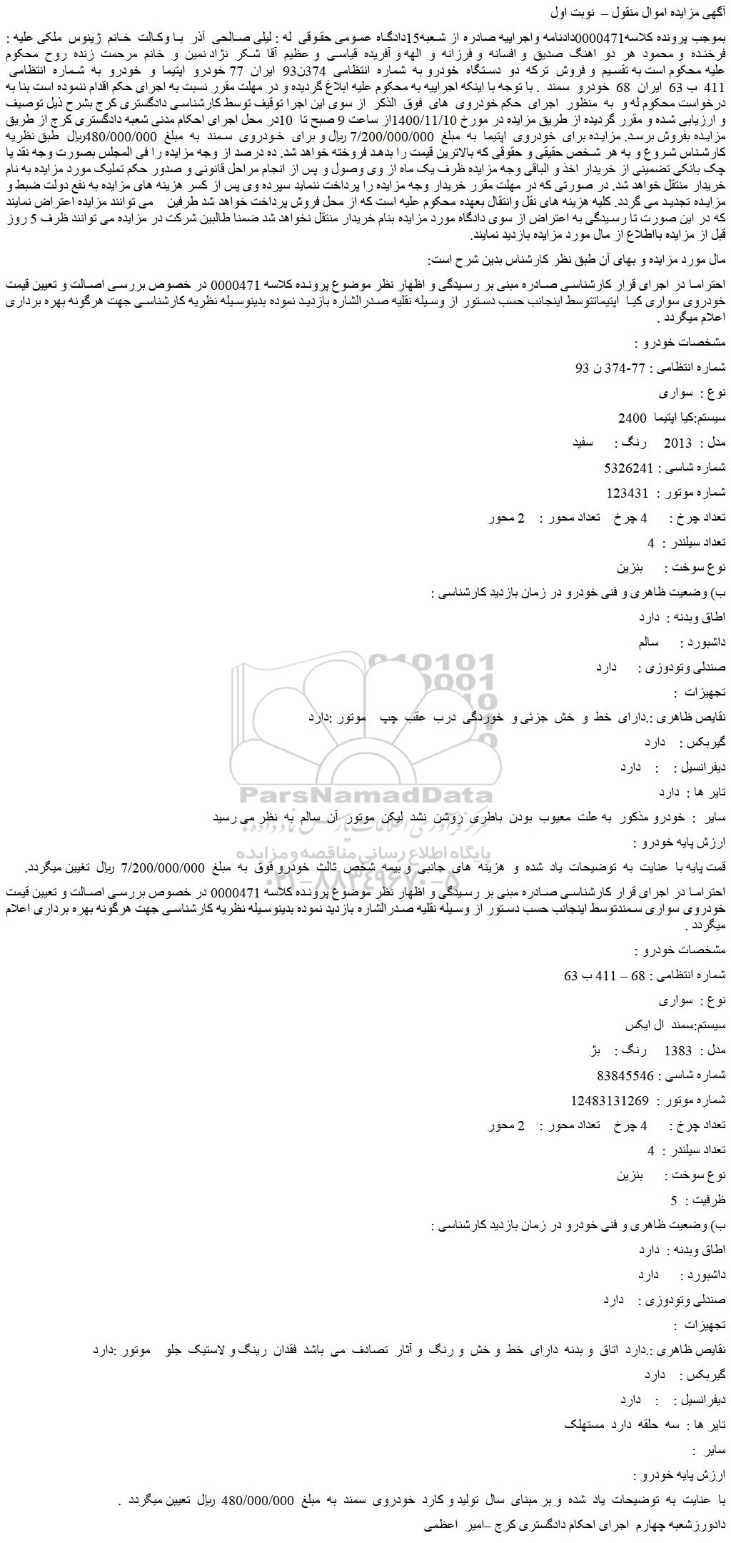 بموجب پرونده کلاسه0000471دادنامه واجراییه صادره از شعبه15دادگاه عمومی حقوقی  له : لیلی صالحی  آذر  با وکالت  خانم  ژینوس  ملکی علیه : فرخنده  و محمود  هر  دو  اهنگ  صدیق  و افسانه  و فرزانه  و  الهه و آفریده  قیاسی  و عظیم  آقا  شکر  نژاد نمین  و  خانم  مرحمت  زنده  روح  محکوم علیه محکوم است به تقسیم  و فروش  ترکه  دو  دستگاه  خودرو به  شماره  انتظامی  374ن93  ایران  77 خودرو  اپتیما  و  خودرو  به  شماره  انتظامی  411  ب 63  ایران  68  خودرو  سمند  . با توجه با اینکه اجراییه به محکوم علیه ابلاغ گردیده و در مهلت مقرر نسبت به اجرای حکم اقدام ننموده است بنا به درخواست محکوم له و  به  منظور  اجرای  حکم خودروی  های  فوق  الذکر  از سوی این اجرا توقیف توسط کارشناسی دادگستری کرج بشرح ذیل توصیف و ارزیابی شده و مقرر گردیده از طریق مزایده در مورخ 1400/11/10از ساعت 9 صبح تا  10در محل اجرای احکام مدنی شعبه دادگستری کرج از طریق مزایده بفروش برسد. مزایده برای  خودروی  اپتیما  به  مبلغ  7/200/000/000 ریال و برای  خودروی  سمند  به  مبلغ  480/000/000ریال  طبق نظریه کارشناس شروع و به هر شخص حقیقی و حقوقی که بالاترین قیمت را بدهد فروخته خواهد شد. ده درصد از وجه مزایده را فی المجلس بصورت وجه نقد یا چک بانکی تضمینی از خریدار اخذ و الباقی وجه مزایده ظرف یک ماه از وی وصول و پس از انجام مراحل قانونی و صدور حکم تملیک مورد مزایده به نام خریدار منتقل خواهد شد. در صورتی که در مهلت مقرر خریدار وجه مزایده را پرداخت ننماید سپرده وی پس از کسر هزینه های مزایده به نفع دولت ضبط و مزایده تجدید می گردد. کلیه هزینه های نقل وانتقال بعهده محکوم علیه است که از محل فروش پرداخت خواهد شد طرفین    می توانند مزایده اعتراض نمایند که در این صورت تا رسیدگی به اعتراض از سوی دادگاه مورد مزایده بنام خریدار منتقل نخواهد شد ضمنا طالبین شرکت در مزایده می توانند ظرف 5 روز قبل از مزایده بااطلاع از مال مورد مزایده بازدید نمایند.