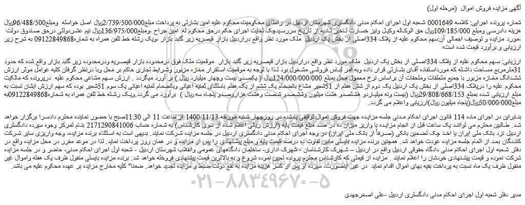 شماره پرونده اجرایی: کلاسه 0001649 شعبه اول اجرای احکام مدنی دادگستری شهرستان اردبیل در راستای محکومیت محکوم علیه امین بشارتی به پرداخت مبلغ2/739/500/000ریال اصل خواسته ومبلغ96/488/500ریال هزینه دادرسی ومبلغ 109/185/000ریال حق الوکاله وکیل ونیز خسارت تاخیر تادیه از تاریخ سررسیدچک لغایت اجرای حکم درحق محکوم له: امین جراح ،ومبلغ136/975/000ریال نیم عشردولتی درحق صندوق دولت ،مورد مزایده و توصیف اجمالی آن:سهم محکوم علیه از پلاک 334اصلی از بخش یک اردبیل ملک مورد نظر واقع دراردبیل بازار قیصریه زیر گنبد بازار ،ویک رشته خط تلفن همراه به شماره09122849868 به شرح زیر ارزیابی و برآورد قیمت شده است؛