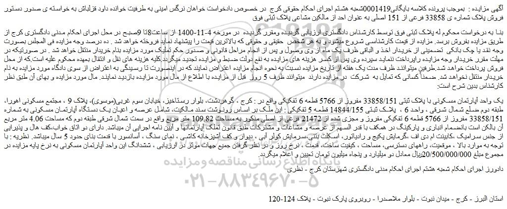 آگهی مزایده : بموجب پرونده کلاسه بایگانی0001419شعبه هشتم اجرای احکام حقوقی کرج در خصوص دادخواست خواهان نرگس امینی به طرفیت خوانده داود قزلباش به خواسته ی صدور دستور فروش پلاک شماره ی 33858 فرعی از 151 اصلی به عنوان احد از مالکین مشاعی پلاک ثبتی فوق