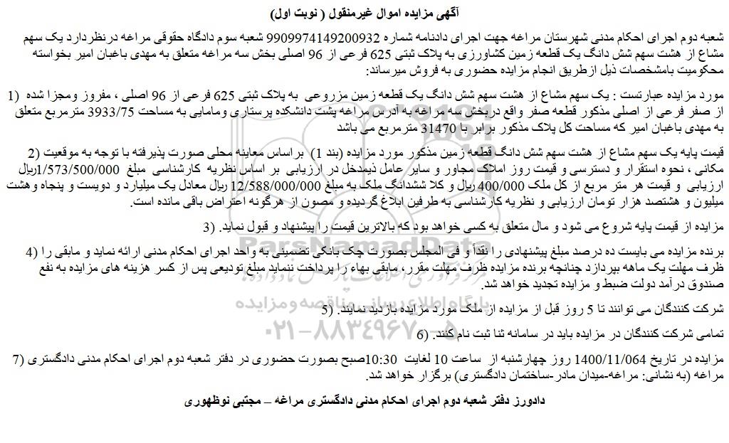 شعبه دوم اجرای احکام مدنی شهرستان مراغه جهت اجرای دادنامه شماره 9909974149200932 شعبه سوم دادگاه حقوقی مراغه درنظردارد یک سهم مشاع از هشت سهم شش دانگ یک قطعه زمین کشاورزی به پلاک ثبتی 625 فرعی از 96 اصلی بخش سه مراغه متعلق به مهدی باغبان امیر بخواسته محکومیت بامشخصات ذیل ازطریق انجام مزایده حضوری به فروش میرساند: