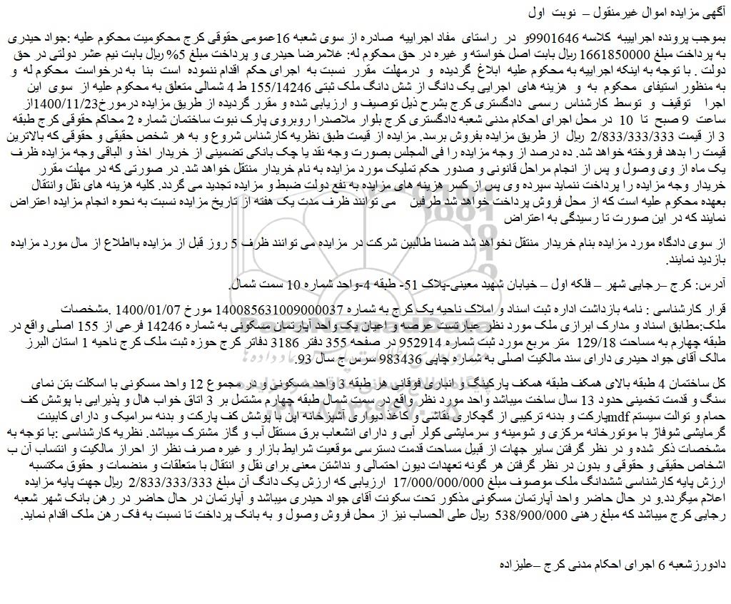 بموجب پرونده اجراییبه  کلاسه 9901646و  در  راستای  مفاد اجراییه  صادره از سوی شعبه 16عمومی حقوقی کرج محکومیت محکوم علیه :جواد حیدری به پرداخت مبلغ 1661850000 ریال بابت اصل خواسته و غیره در حق محکوم له: غلامرضا حیدری و پرداخت مبلغ 5% ریال بابت نیم عشر دولتی در حق دولت . با توجه به اینکه اجراییه به محکوم علیه  ابلاغ  گردیده  و  درمهلت  مقرر  نسبت به  اجرای حکم  اقدام ننموده  است  بنا  به درخواست  محکوم له  و  به منظور استیفای  محکوم  به  و  هزینه های  اجرایی یک دانگ از شش دانگ ملک ثبتی 155/14246 ط 4 شمالی متعلق به محکوم علیه از  سوی  این اجرا    توقیف  و  توسط  کارشناس  رسمی  دادگستری کرج بشرح ذیل توصیف و ارزیابی شده و مقرر گردیده از طریق مزایده درمورخ1400/11/23از ساعت  9 صبح  تا  10  در محل اجرای احکام مدنی شعبه دادگستری کرج بلوار ملاصدرا روبروی پارک نبوت ساختمان شماره 2 محاکم حقوقی کرج طبقه 3 از قیمت 2/833/333/333  ریال  از طریق مزایده بفروش برسد. مزایده از قیمت طبق نظریه کارشناس شروع و به هر شخص حقیقی و حقوقی که بالاترین قیمت را بدهد فروخته خواهد شد. ده درصد از وجه مزایده را فی المجلس بصورت وجه نقد یا چک بانکی تضمینی از خریدار اخذ و الباقی وجه مزایده ظرف یک ماه از وی وصول و پس از انجام مراحل قانونی و صدور حکم تملیک مورد مزایده به نام خریدار منتقل خواهد شد. در صورتی که در مهلت مقرر خریدار وجه مزایده را پرداخت ننماید سپرده وی پس از کسر هزینه های مزایده به نفع دولت ضبط و مزایده تجدید می گردد. کلیه هزینه های نقل وانتقال بعهده محکوم علیه است که از محل فروش پرداخت خواهد شد طرفین    می توانند ظرف مدت یک هفته از تاریخ مزایده نسبت به نحوه انجام مزایده اعتراض نمایند که در این صورت تا رسیدگی به اعتراض