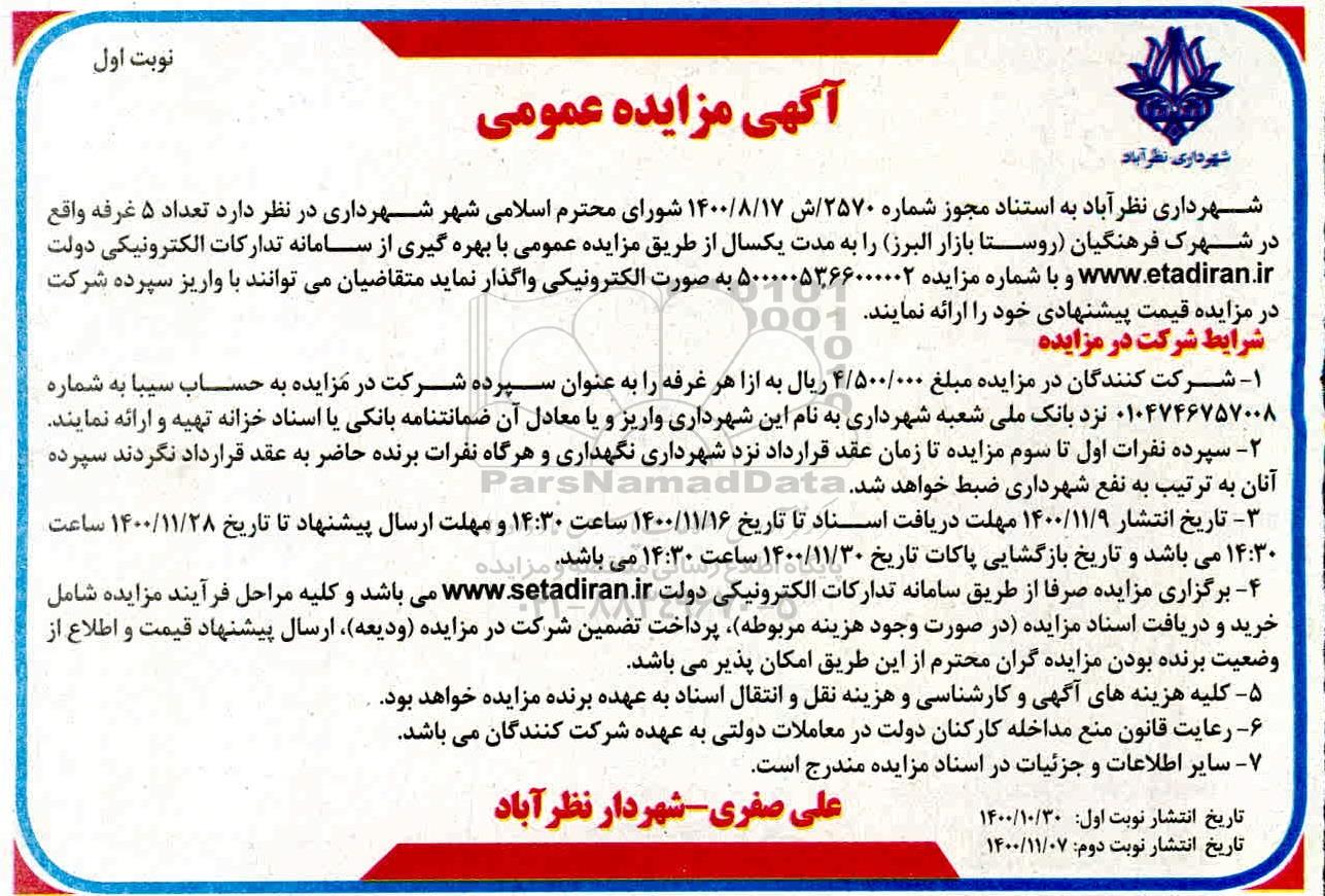 شهرداری نظرآباد در نظر دارد تعداد 5 غرفه واقع در شهرک فرهنگیان (روستا بازار البرز) را به مدت یکسال از طریق مزایده عمومی با بهره گیری از سامانه تدارکات الکترونیکی دولت ستاد و با شماره مزایده 5000005366000002 به صورت الکترونیکی واگذار نماید. متقاضیان می توانند با واریز سپرده شرکت در مزایده قیمت پینشهادی خود را ارائه نمایند