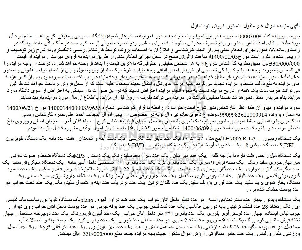 بموجب پرونده کلاسه0000300 مطروحه در این اجرا و با عنایت به صدور اجراییه صادرهاز شعبه10دادگاه عمومی وحقوقی کرج له : خانم نیره آل بویه علیه : آقای امید ظاهری دایر بر رفع تصرف عدوانی با توجه به اجرای حکم و رفع تصرف اموالی از محکوم علیه در ملک باقی مانده بود که در راستای ماده 66 قانون اجرای احکام مدنی پس از انجام کارشناسی و ابلاغ آن به اصحاب پرونده توسط کارشناس رسمی دادگستری به شرح زیر توصیف و ارزیابی شده و مقرر است مورخ1400/11/05ازساعت 9الی10صبح در محل اجرای احکام مدنی از طریق مزایده به فروش میرسد . مزایده از قیمت 330/000/000ریال طبق نظریه کارشناس شروع و به هر شخص حقیقی و حقوقی که بالاترین قیمت را بدهد فروخته خواهد شد. ده درصد از وجه مزایده را فی المجلس بصورت وجه نقد یا چک بانکی تضمینی از خریدار اخذ و الباقی وجه مزایده ظرف یک ماه از وی وصول و پس از انجام مراحل قانونی و صدور حکم تملیک مورد مزایده به نام خریدار منتقل خواهد شد. در صورتی که در مهلت مقرر خریدار وجه مزایده را پرداخت ننماید سپرده وی پس از کسر هزینه های مزایده به نفع دولت ضبط و مزایده تجدید می گردد. کلیه هزینه های نقل وانتقال بعهده محکوم علیه است که از محل فروش پرداخت خواهد شد طرفین می توانند ظرف مدت یک هفته از تاریخ مزایده نسبت به نحوه انجام مزایده اعتراض نمایند که در این صورت تا رسیدگی به اعتراض از سوی دادگاه مورد مزایده بنام خریدار منتقل نخواهد شد ضمنا طالبین شرکت در مزایده می توانند ظرف 5 روز قبل از مزایده بااطلاع از مال مورد مزایده بازدید نمایند.