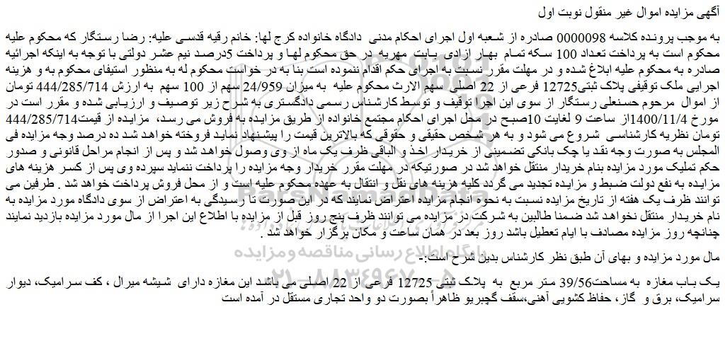 به موجب پرونده کلاسه 0000098 صادره از شعبه اول اجرای احکام مدنی دادگاه خانواده کرج لها: خانم رقیه قدسی علیه: رضا رستگار که محکوم علیه محکوم است به پرداخت تعداد 100 سکه تمام بهار ازادی بابت مهریه در حق محکوم لها و پرداخت 5درصد نیم عشر دولتی با توجه به اینکه اجرائیه صادره به محکوم علیه ابلاغ شده و در مهلت مقرر نسبت به اجرای حکم اقدام ننموده است بنا به در خواست محکوم له به منظور استیفای محکوم به و هزینه اجرایی ملک توقیفی پلاک ثبتی12725 فرعی از 22 اصلی سهم الارث محکوم علیه به میزان 24/959 سهم از 100 سهم به ارزش 444/285/714 تومان از اموال مرحوم حسنعلی رستگار از سوی این اجرا توقیف و توسط کارشناس رسمی دادگستری به شرح زیر توصیف و ارزیابی شده و مقرر است در مورخ 1400/11/4از ساعت 9 لغایت 10صبح در محل اجرای احکام مجتمع خانواده از طریق مزایده به فروش می رسد، مزایده از قیمت444/285/714 تومان نظریه کارشناسی شروع می شود و به هر شخص حقیقی و حقوقی که بالاترین قیمت را پیشنهاد نماید فروخته خواهد شد ده درصد وجه مزایده فی المجلس به صورت وجه نقد یا چک بانکی تضمینی از خریدار اخذ و الباقی ظرف یک ماه از وی وصول خواهد شد و پس از انجام مراحل قانونی و صدور حکم تملیک مورد مزایده بنام خریدار منتقل خواهد شد در صورتیکه در مهلت مقرر خریدار وجه مزایده را پرداخت ننماید سپرده وی پس از کسر هزینه های مزایده به نفع دولت ضبط و مزایده تجدید می گردد کلیه هزینه های نقل و انتقال به عهده محکوم علیه است و از محل فروش پرداخت خواهد شد . طرفین می توانند ظرف یک هفته از تاریخ مزایده نسبت به نحوه انجام مزایده اعتراض نمایند که در این صورت تا رسیدگی به اعتراض از سوی دادگاه مورد مزایده به نام خریدار منتقل نخواهد شد ضمنا طالبین به شرکت در مزایده می توانند ظرف پنج روز قبل از مزایده با اطلاع این اجرا از مال مورد مزایده بازدید نمایند چنانچه روز مزایده مصادف با ایام تعطیل باشد روز بعد در همان ساعت و مکان برگزار خواهد شد .