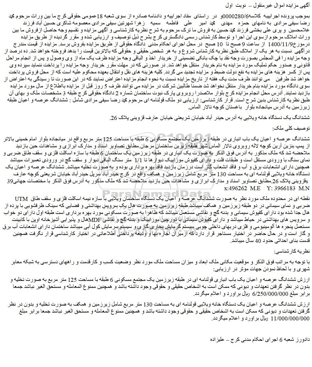 ششدانگ عرصه و اعیان یک باب انباری در طبقه زیرزمین یک مجتمع مسکونی 6 طبقه با مساحت 125 متر مربع واقع در میانجاده بلوار امام خمینی بالاتر از پمپ بنزین آرین کوچه لاله روبروی تالار الماس شهر طبقه زیرین ساختمان مرجان.مطابق تصاویر اسناد و مدارک ابرازی و مشاهدات حین بازدید ملاحضه شد که ملک مذکور به آدرس فوق الذکر به صورت یک انباری در طبقه زیرزمین یک ساختمان 6 طبقه با سازه اسکلت فلزی و سقف طاق ضربی و نمای سنگ با ورودی مستقل است و طبقات فلت و دارای کفپوش موزاییک دیوارها تا 1/1 متر سنگ الباقی دیوار و سقف گچ در ورودی تعمیرات میباشد همچنین دارای انشعابات برق و آب و فاقد انشعاب گاز است درزمان بازدید فاقد بهره برداری بوده و به صورت تخلیه میباشد. ششدانگ عرصه و اعیان یک دستگاه خانه ویلایی قولنامه ای به مساحت 130 متر مربع شامل زیرزمین و همکف واقع در کرج حیدرآباد سرپل حیدرآباد خیابان شریعتی کوچه عارف قزوینی پلاک 26.مطابق تصاویر اسناد و مدارک ابرازی و مشاهدات حین بازدید ملاحضه شد که ملک مذکور به آدرس فوق الذکر با مختصات جهانی39 s x:496262 M.E Y: 3966183 M.N
