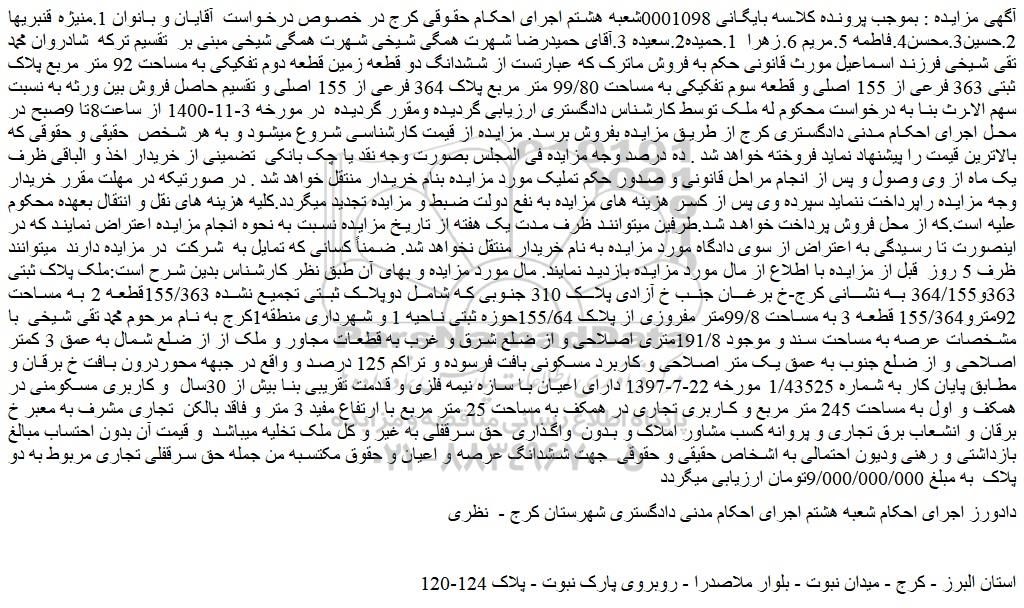 آگهی مزایده : بموجب پرونده کلاسه بایگانی 0001098شعبه هشتم اجرای احکام حقوقی کرج در خصوص درخواست آقایان و بانوان 1.منیژه قنبریها 2.حسین3.محسن4.فاطمه 5.مریم 6.زهرا 1.حمیده2.سعیده 3.آقای حمیدرضا شهرت همگی شیخی شهرت همگی شیخی مبنی بر تقسیم ترکه شادروان محمد تقی شیخی فرزند اسماعیل مورث قانونی حکم به فروش ماترک که عبارتست از ششدانگ دو قطعه زمین قطعه دوم تفکیکی به مساحت 92 متر مربع پلاک ثبتی 363 فرعی از 155 اصلی و قطعه سوم تفکیکی به مساحت 99/80 متر مربع پلاک 364 فرعی از 155 اصلی و تقسیم حاصل فروش بین ورثه به نسبت سهم الارث بنا به درخواست محکوم له ملک توسط کارشناس دادگستری ارزیابی گردیده ومقرر گردیده در مورخه 3-11-1400 از ساعت8تا 9صبح در محل اجرای احکام مدنی دادگستری کرج از طریق مزایده بفروش برسد. مزایده از قیمت کارشناسی شروع میشود و به هر شخص حقیقی و حقوقی که بالاترین قیمت را پیشنهاد نماید فروخته خواهد شد . ده درصد وجه مزایده فی المجلس بصورت وجه نقد یا چک بانکی تضمینی از خریدار اخذ و الباقی ظرف یک ماه از وی وصول و پس از انجام مراحل قانونی و صدور حکم تملیک مورد مزایده بنام خریدار منتقل خواهد شد . در صورتیکه در مهلت مقرر خریدار وجه مزایده راپرداخت ننماید سپرده وی پس از کسر هزینه های مزایده به نفع دولت ضبط و مزایده تجدید میگردد.کلیه هزینه های نقل و انتقال بعهده محکوم علیه است.که از محل فروش پرداخت خواهد شد.طرفین میتوانند ظرف مدت یک هفته از تاریخ مزایده نسبت به نحوه انجام مزایده اعتراض نمایند که در اینصورت تا رسیدگی به اعتراض از سوی دادگاه مورد مزایده به نام خریدار منتقل نخواهد شد. ضمناً کسانی که تمایل به شرکت در مزایده دارند میتوانند ظرف 5 روز قبل از مزایده با اطلاع از مال مورد مزایده بازدید نمایند. مال مورد مزایده و بهای آن طبق نظر کارشناس بدین شرح است:ملک پلاک ثبتی 363و364/155 به نشانی کرج-خ برغان جنب خ آزادی پلاک 310 جنوبی که شامل دوپلاک ثبتی تجمیع نشده 155/363قطعه 2 به مساحت 92مترو155/364 قطعه 3 به مساحت 99/8متر مفروزی از پلاک 155/64حوزه ثبتی ناحیه 1 و شهرداری منطقه1کرج به نام مرحوم محمد تقی شیخی با مشخصات عرصه به مساحت سند و موجود 191/8متری اصلاحی و از ضلع شرق و غرب به قطعات مجاور و ملک از از ضلع شمال به عمق 3 کمتر اصلاحی و از ضلع جنوب به عمق یک متر اصلاحی و کاربرد مسکونی بافت فرسوده و تراکم 125 درصد و واقع در جبهه محوردرون بافت خ برقان و مطابق پایان کار به شماره 1/43525 مورخه 22-7-1397 دارای اعیان با سازه نیمه فلزی و قدمت تقریبی بنا بیش از 30سال و کاربری مسکومنی در همکف و اول به مساحت 245 متر مربع و کاربری تجاری در همکف به مساحت 25 متر مربع با ارتفاع مفید 3 متر و فاقد بالکن تجاری مشرف به معبر خ برقان و انشعاب برق تجاری و پروانه کسب مشاور املاک و بدون واگذاری حق سرقفلی به غیر و کل ملک تخلیه میباشد و قیمت آن بدون احتساب مبالغ بازداشتی و رهنی ودیون احتمالی به اشخاص حقیقی و حقوقی جهت ششدانگ عرصه و اعیان و حقوق مکتسبه من جمله حق سرقفلی تجاری مربوط به دو پلاک به مبلغ 9/000/000/000تومان ارزیابی میگردد