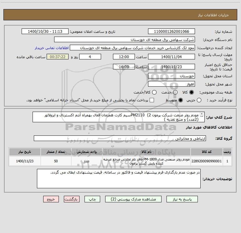 شرح کلی نیاز: مودم روتر صنعت شرکت پرمون PM2110 (2سیم کارت همزمان فعال بهمراه آنتم اکسترنال و ایزولاتور (2عدد) و منبع تغذیه )