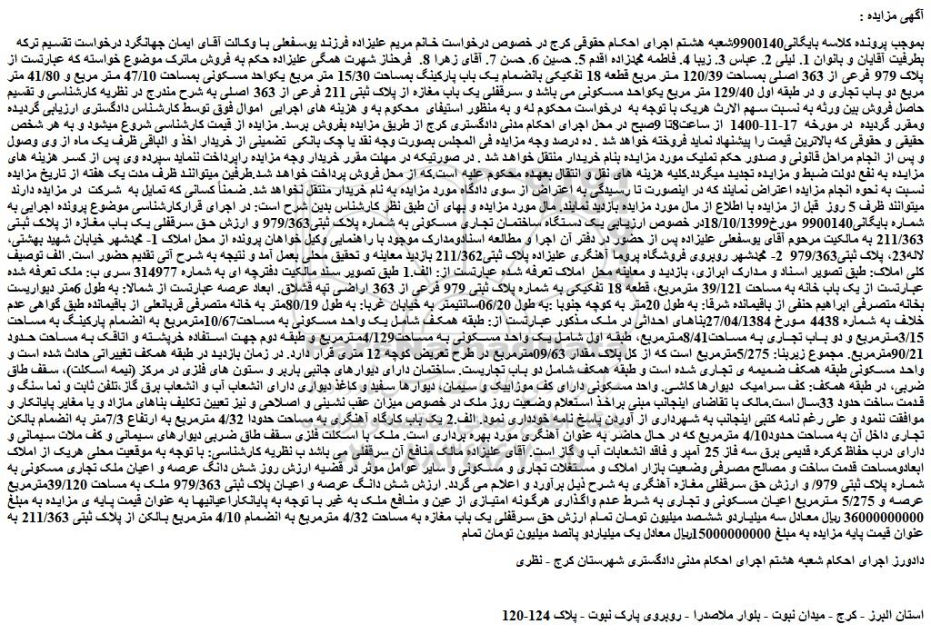 بموجب پرونده کلاسه بایگانی9900140شعبه هشتم اجرای احکام حقوقی کرج در خصوص درخواست خانم مریم علیزاده فرزند یوسفعلی با وکالت آقای ایمان جهانگرد درخواست تقسیم ترکه بطرفیت آقایان و بانوان 1. لیلی 2. عباس 3. زیبا 4. فاطمه محمدزاده اقدم 5. حسین 6. حسن 7. آقای زهرا 8.  فرحناز شهرت همگی علیزاده حکم به فروش ماترک موضوع خواسته که عبارتست از پلاک 979 فرعی از 363 اصلی بمساحت 120/39 متر مربع قطعه 18 تفکیکی بانضمام یک باب پارکینگ بمساحت 15/30 متر مربع یکواحد مسکونی بمساحت 47/10 متر مربع و 41/80 متر مربع دو باب تجاری و در طبقه اول 129/40 متر مربع یکواحد مسکونی می باشد و سرقفلی یک باب مغازه از پلاک ثبتی 211 فرعی از 363 اصلی به شرح مندرج در نظریه کارشناسی و تقسیم حاصل فروش بین ورثه به نسبت سهم الارث هریک با توجه به  درخواست محکوم له و به منظور استیفای  محکوم به و هزینه های اجرایی  اموال فوق توسط کارشناس دادگستری ارزیابی گردیده ومقرر گردیده  در مورخه  17-11-1400  از ساعت8تا 9صبح در محل اجرای احکام مدنی دادگستری کرج از طریق مزایده بفروش برسد. مزایده از قیمت کارشناسی شروع میشود و به هر شخص  حقیقی و حقوقی که بالاترین قیمت را پیشنهاد نماید فروخته خواهد شد . ده درصد وجه مزایده فی المجلس بصورت وجه نقد یا چک بانکی  تضمینی از خریدار اخذ و الباقی ظرف یک ماه از وی وصول و پس از انجام مراحل قانونی و صدور حکم تملیک مورد مزایده بنام خریدار منتقل خواهد شد . در صورتیکه در مهلت مقرر خریدار وجه مزایده راپرداخت ننماید سپرده وی پس از کسر هزینه های مزایده به نفع دولت ضبط و مزایده تجدید میگردد.کلیه هزینه های نقل و انتقال بعهده محکوم علیه است.که از محل فروش پرداخت خواهد شد.طرفین میتوانند ظرف مدت یک هفته از تاریخ مزایده نسبت به نحوه انجام مزایده اعتراض نمایند که در اینصورت تا رسیدگی به اعتراض از سوی دادگاه مورد مزایده به نام خریدار منتقل نخواهد شد. ضمناً کسانی که تمایل به  شرکت  در مزایده دارند  میتوانند ظرف 5 روز  قبل از مزایده با اطلاع از مال مورد مزایده بازدید نمایند. مال مورد مزایده و بهای آن طبق نظر کارشناس بدین شرح است: در اجرای قرارکارشناسی موضوع پرونده اجرایی به شماره بایگانی9900140 مورخ18/10/1399در خصوص ارزیابی یک دستگاه ساختمان تجاری مسکونی به شماره پلاک ثبتی979/363 و ارزش حق سرقفلی یک باب مغازه از پلاک ثبتی 211/363 به مالکیت مرحوم آقای یوسفعلی علیزاده پس از حضور در دفتر آن اجرا و مطالعه اسنادومدارک موجود با راهنمایی وکیل خواهان پرونده از محل املاک 1- محمدشهر خیابان شهید بهشتی، لاله23، پلاک ثبتی979/363  2- محمدشهر روبروی فروشگاه پروما آهنگری علیزاده پلاک ثبتی211/362 بازدید معاینه و تحقیق محلی بعمل آمد و نتیجه به شرح آتی تقدیم حضور است. الف توصیف کلی املاک: طبق تصویر اسناد و مدارک ابرازی، بازدید و معاینه محل  املاک تعرفه شده عبارتست از: الف.1 طبق تصویر سند مالکیت دفترچه ای به شماره 314977 سری ب: ملک تعرفه شده عبارتست از یک باب خانه به مساحت 39/121 مترمربع، قطعه 18 تفکیکی به شماره پلاک ثبتی 979 فرعی از 363 اراضی تپه قشلاق. ابعاد عرصه عبارتست از شمالا: به طول 6متر دیواریست بخانه متصرفی ابراهیم حنفی از باقیمانده شرقا: به طول 20متر به کوچه جنوبا :به طول 06/20سانتیمتر به خیابان غربا: به طول 80/19متر به خانه متصرفی قربانعلی از باقیمانده طبق گواهی عدم خلاف به شماره 4438 مورخ 27/04/1384بناهای احداثی در ملک مذکور عبارتست از: طبقه همکف شامل یک واحد مسکونی به مساحت10/67مترمربع به انضمام پارکینگ به مساحت 3/15مترمربع و دو باب تجاری به مساحت8/41مترمربع، طبقه اول شامل یک واحد مسکونی به مساحت4/129مترمربع و طبقه دوم جهت استفاده خرپشته و اتاقک به مساحت حدود 90/21مترمربع. مجموع زیربنا: 5/275مترمربع است که از کل پلاک مقدار 09/63مترمربع در طرح تعریض کوچه 12 متری قرار دارد. در زمان بازدید در طبقه همکف تغییراتی حادث شده است و واحد مسکونی طبقه همکف ضمیمه ی تجاری شده است و طبقه همکف شامل دو باب تجاریست. ساختمان دارای دیوارهای جانبی 