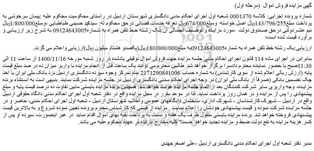 شماره پرونده اجرایی: کلاسه 0001370 شعبه اول اجرای احکام مدنی دادگستری شهرستان اردبیل در راستای محکومیت محکوم علیه :پیمان سرخوشی به پرداخت مبلغ143/796/255ریال اصل خواسته  ومبلغ674/000ریال تعرفه خدمات قضائی درحق محکوم له: سیدمحمد حسینی طباطبایی ،ومبلغ1/800/000ریال نیم عشردولتی درحق صندوق دولت  ،مورد مزایده و توصیف اجمالی آن:یک رشته خط تلفن همراه به شماره09124643005 به شرح زیر ارزیابی و برآورد قیمت شده است؛