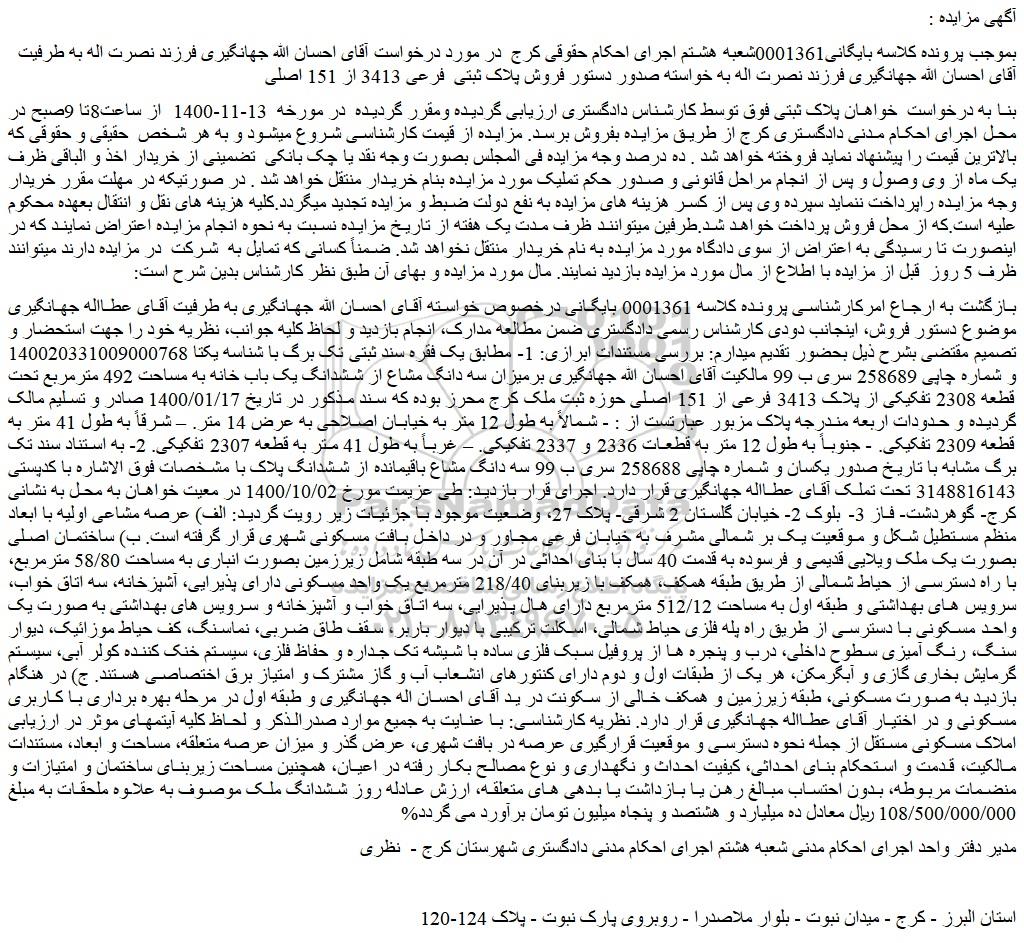 بموجب پرونده کلاسه بایگانی0001361شعبه هشتم اجرای احکام حقوقی کرج  در مورد درخواست آقای احسان الله جهانگیری فرزند نصرت اله به طرفیت آقای احسان الله جهانگیری فرزند نصرت اله به خواسته صدور دستور فروش پلاک ثبتی  فرعی 3413 از 151 اصلی